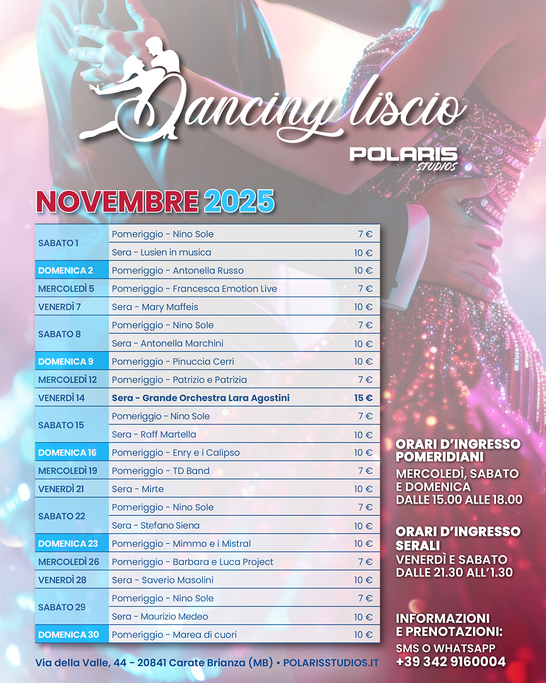 | sabato | 15.00 – 18.00 21.30 – 01.30 |